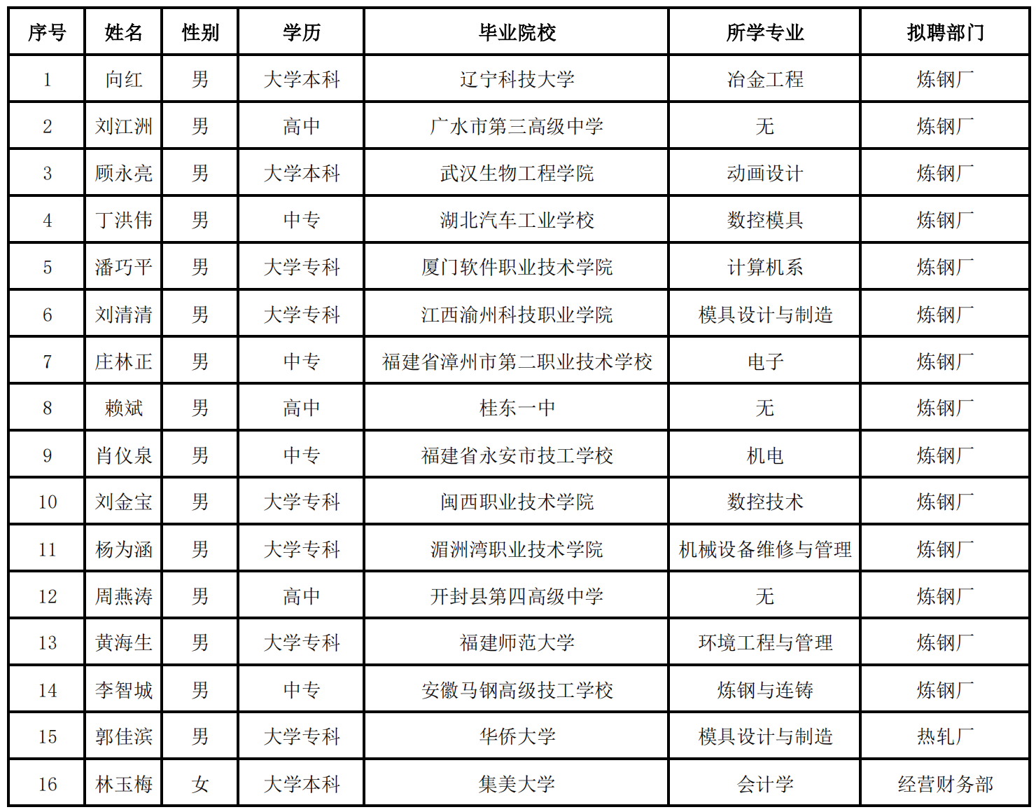 依據(jù)寶鋼德盛不銹鋼有限公司2023年招聘計(jì)劃,結(jié)合集團(tuán)公司《陽光招聘具體操作指引》工作要求,通過個(gè)人自愿報(bào)名、資格復(fù)審、面試考評等環(huán)節(jié),經(jīng)集團(tuán)公司審批通過,現(xiàn)將2023年社會招聘第一批擬聘人員名單公示如下: